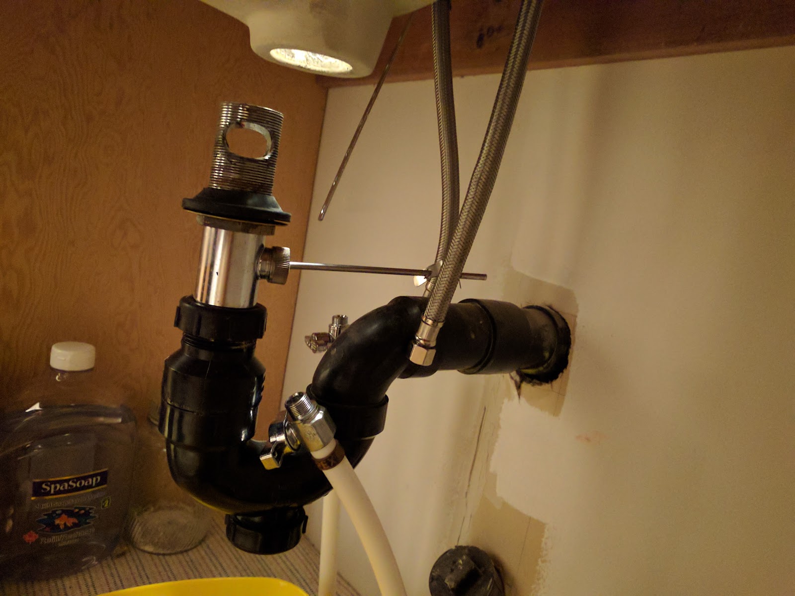 The plumbing for the drain is ABS, so I had to cut the drain pipe and move it back a bit. Not a lot of trouble, except for the tailpiece fitting. I bought a slip-joint adapter at Home Cheapo that was not the right size, despite it saying 1 1/2" to 1 1/4" on the fitting. A trip to Kent netted the right sized adapter.