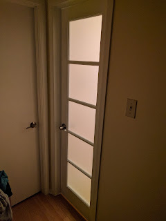I hung a textured glass door on the main bathroom last night. Easy peasey. Sadly, there's a streak of undercoating paint that was underneath the protective plastic film.