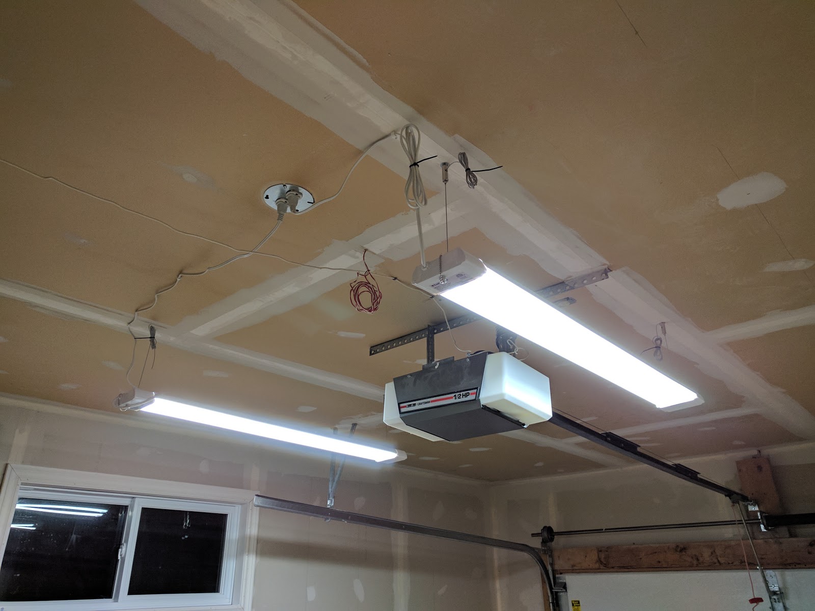 The garage originally had a bare bulb socket with a switch in the front and one in the back porch. I had the electrician who came to do some work around the house replace the socket with an electrical socket and plugged in two LED shop lamps I got from Costco. 4000 lumens per fixture makes the garage feel like you're standing on the sun.