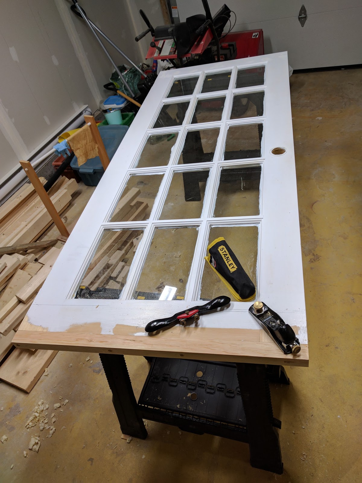 The french door for the kitchen/back porch needed a bit more work. The door was two inches too short for the frame, so I glued some pine to the bottom reinforced it with some dowelling and planed it flush with the surface of the door. Aside from some barely-visible plane cuts due to overly aggressive planing, the door looks as good as any other.We have a new textured glass door for the main bathroom, but that will have to wait until I cut the holes for the lockset. I bet getting the protective plastic off the glass is going to be the hardest part of hanging that door.