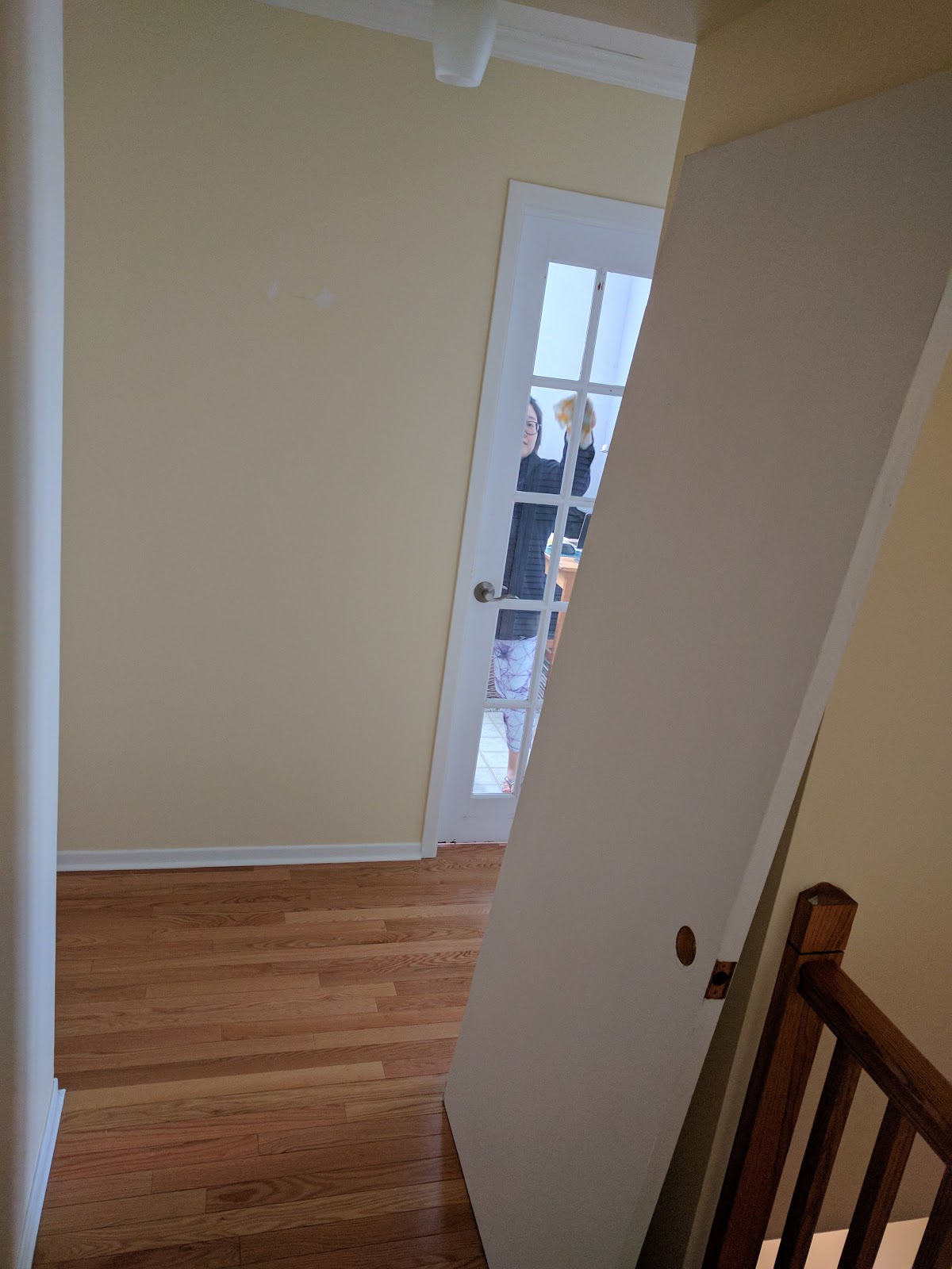 Replaced the hollow-core door on Seyoung's office and hung a french door. We picked up the door at the Re-store for about $30 and it took about an hour to hang it. We only had to recut the lower hinge gain on the door to rehang it. It has a few dings and bits that need filling, I picked up some epoxy wood filler and gloss latex paint to match the paint already on it.I'm thinking of replacing the main bathroom door with a (privacy) glass-paned door to let in more light in the upstairs hallway, too.