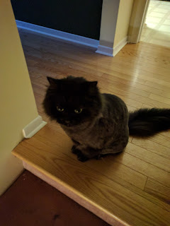 That's it for this week. Here's a shot of Poopy scowling down the stairs as I trudge up and down with tools and things.