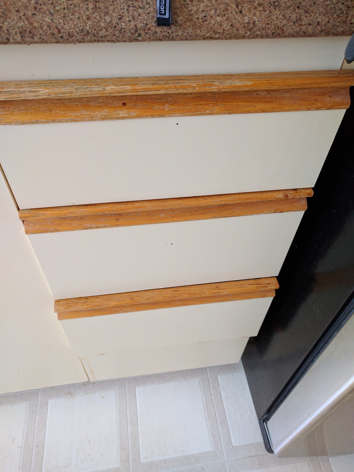 Our kitchen cabinets are the 90's style with molding grips. Some people like them, we do not. They give no visual cue to indicate where the hinge side is and I have nearly pulled my fingernails off on a couple of occasions while tring to open a door. So, I went on ebay and ordered some inexpensive knobs and drawer pulls.